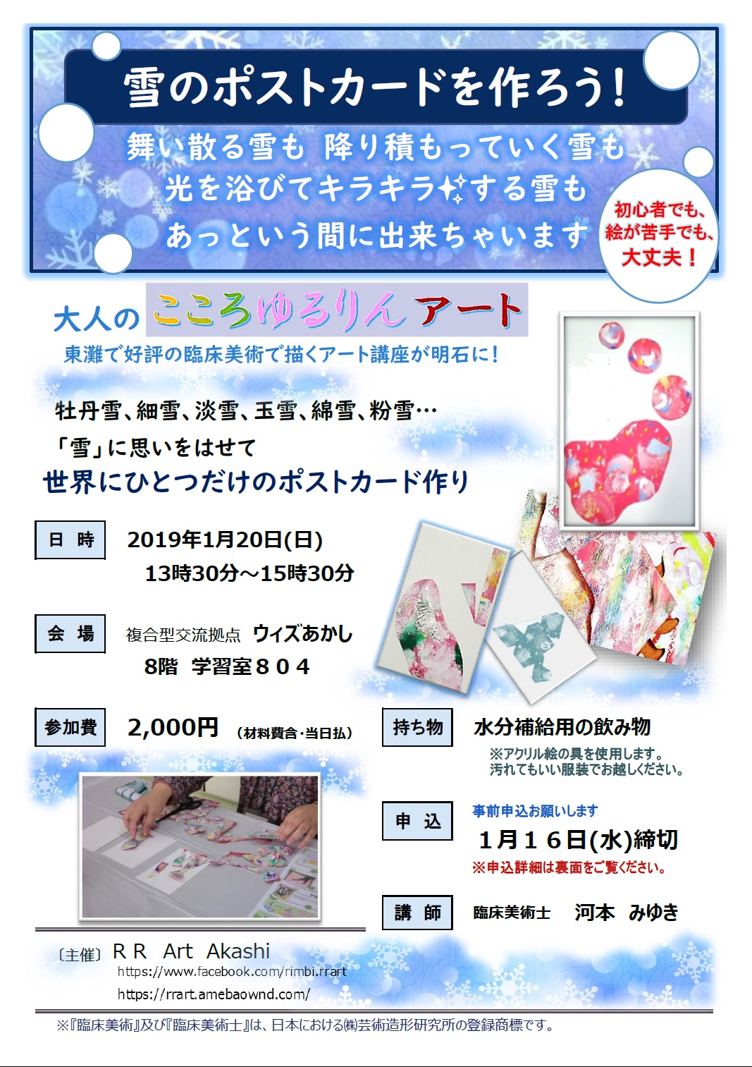 開催日:2019年1月20日(日) 「雪のポストカードを作ろう!」こころゆるりんアート 明石教室