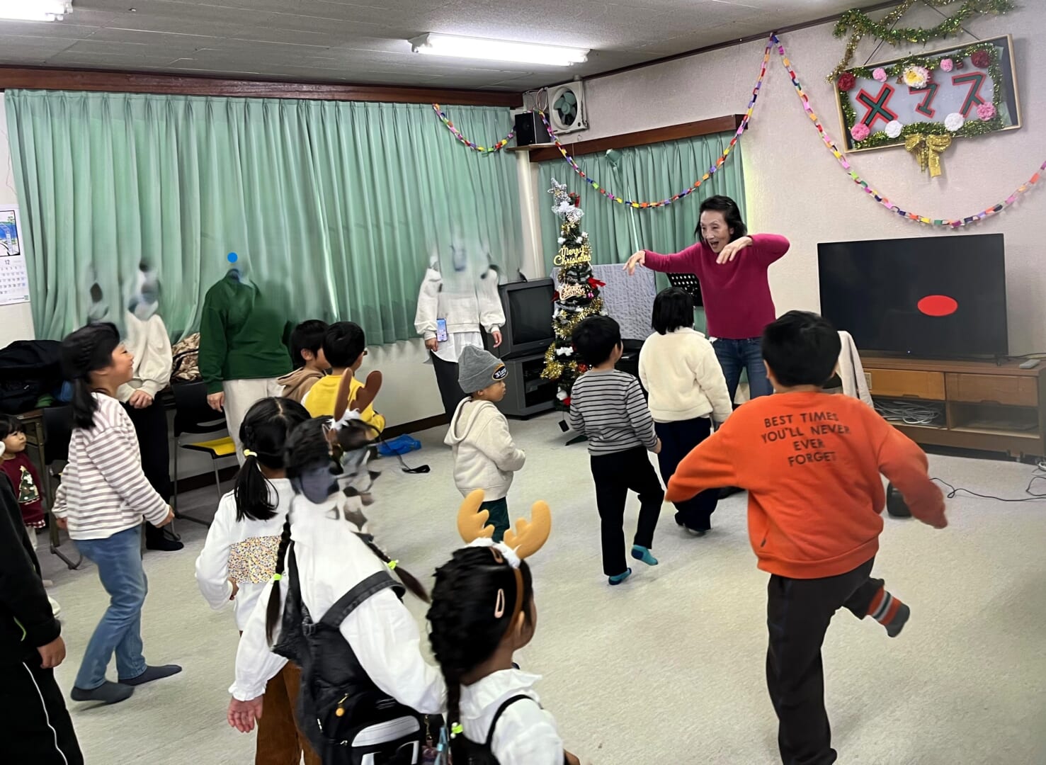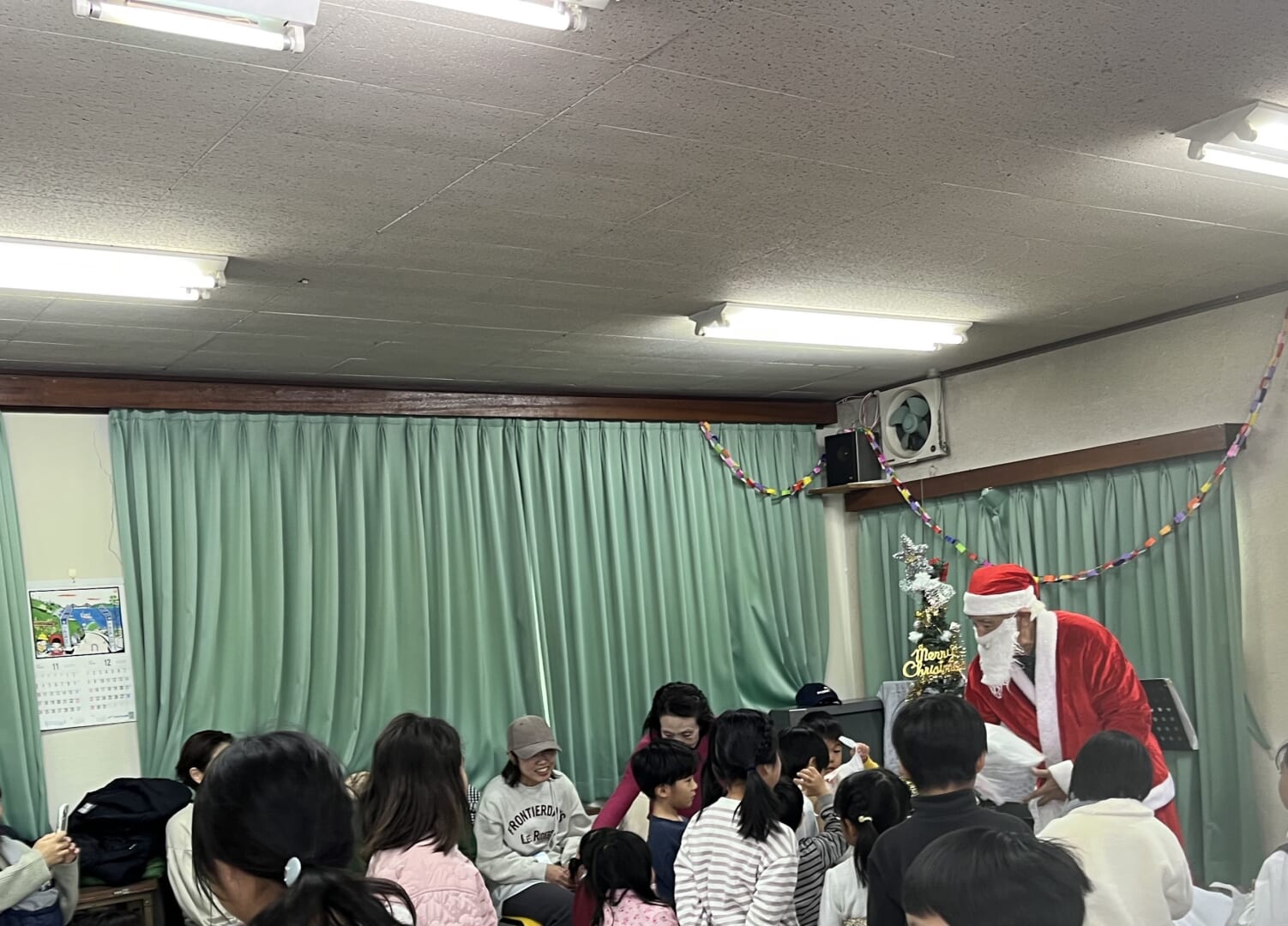 当日、臼は藤江町内会から借り、指導も藤江町内会の藤田さんに、出来上がったお餅の切り方は西松江の松尾さんにと他の町内会の方の指導のもとで実現した餅つき大会、子ども達も小さな杵で餅つきを体験しました。午後からのクリスマス会は昨年度同様の段取りで開催し、こども達はサンタさんの登場に大喜び。子ども達50人、おとうさん・おかあさんが45人、合わせて95人の参加でした。
