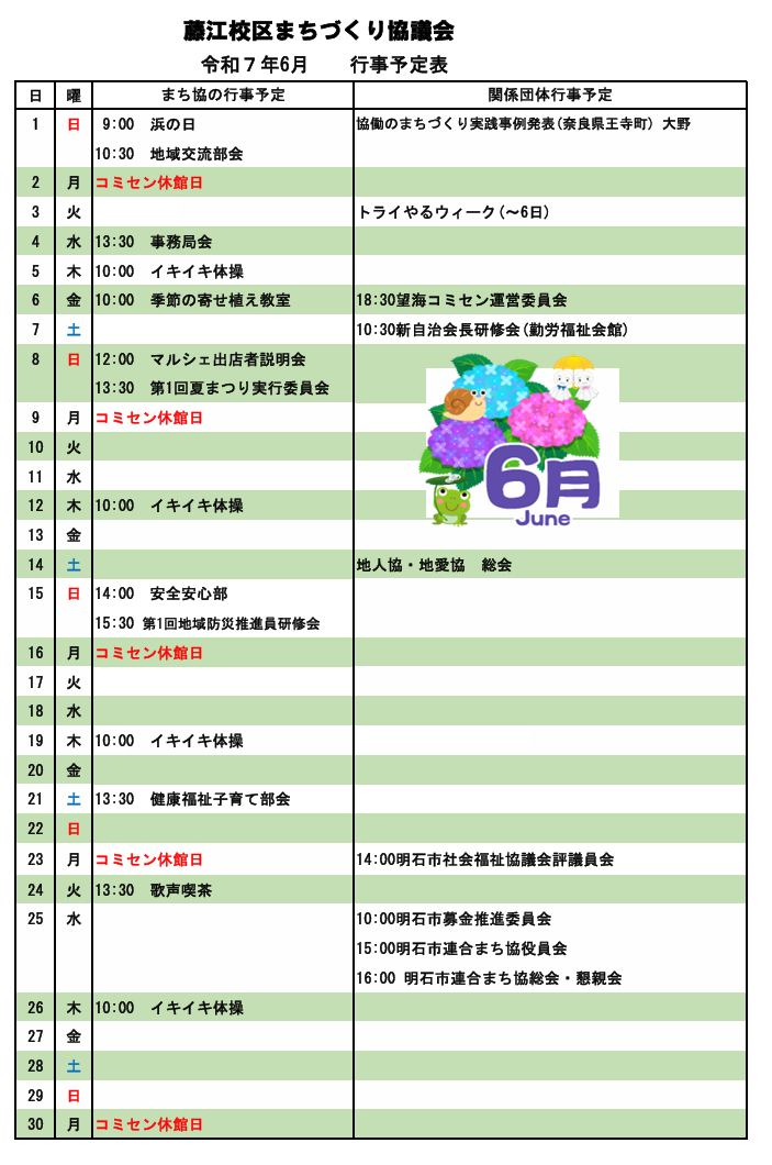 藤江校区まちづくり協議会令和7年6月の行事予定をお知らせします。