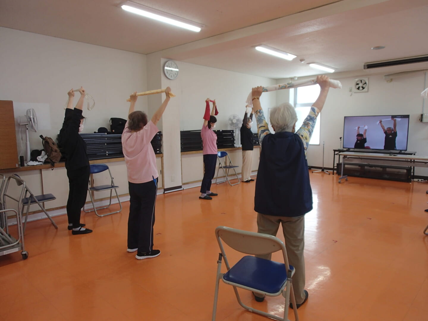 椅子に座ってゆっくりと捻り腰のコリを取るストレッチ、タオルを両手で広げ上下に8カウントで上げ下げ肩と胸のストレッチ等です。