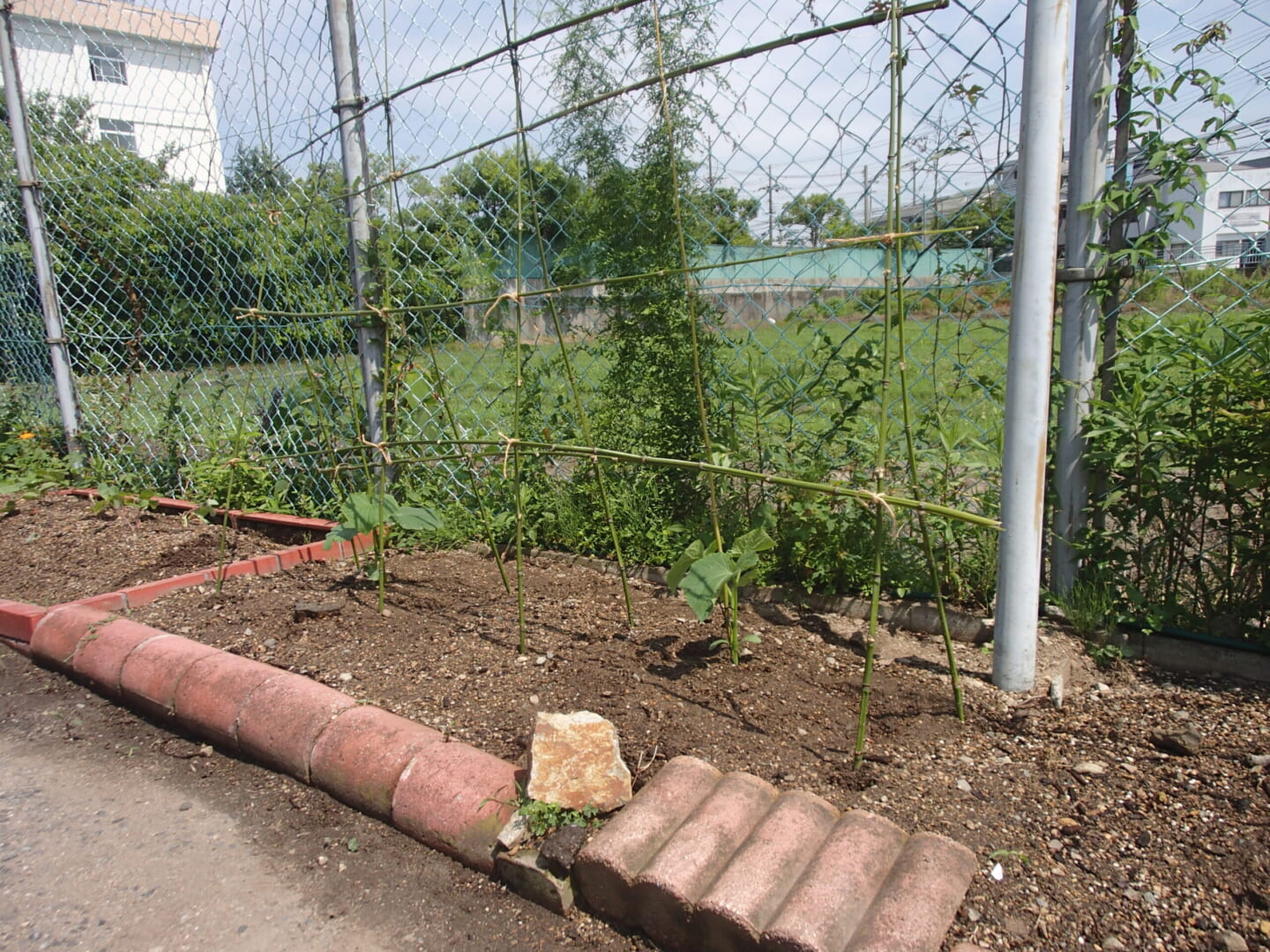 これからの成長を考慮して、お花は花を摘み取り、野菜には支柱を立てました。