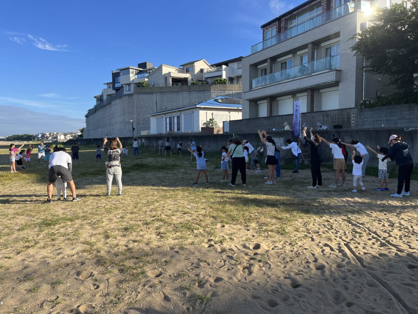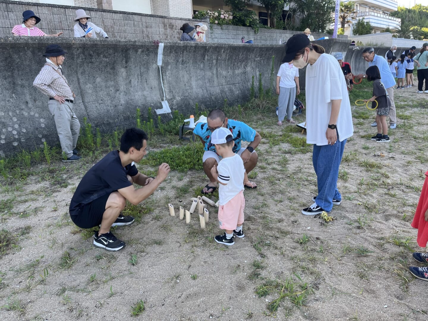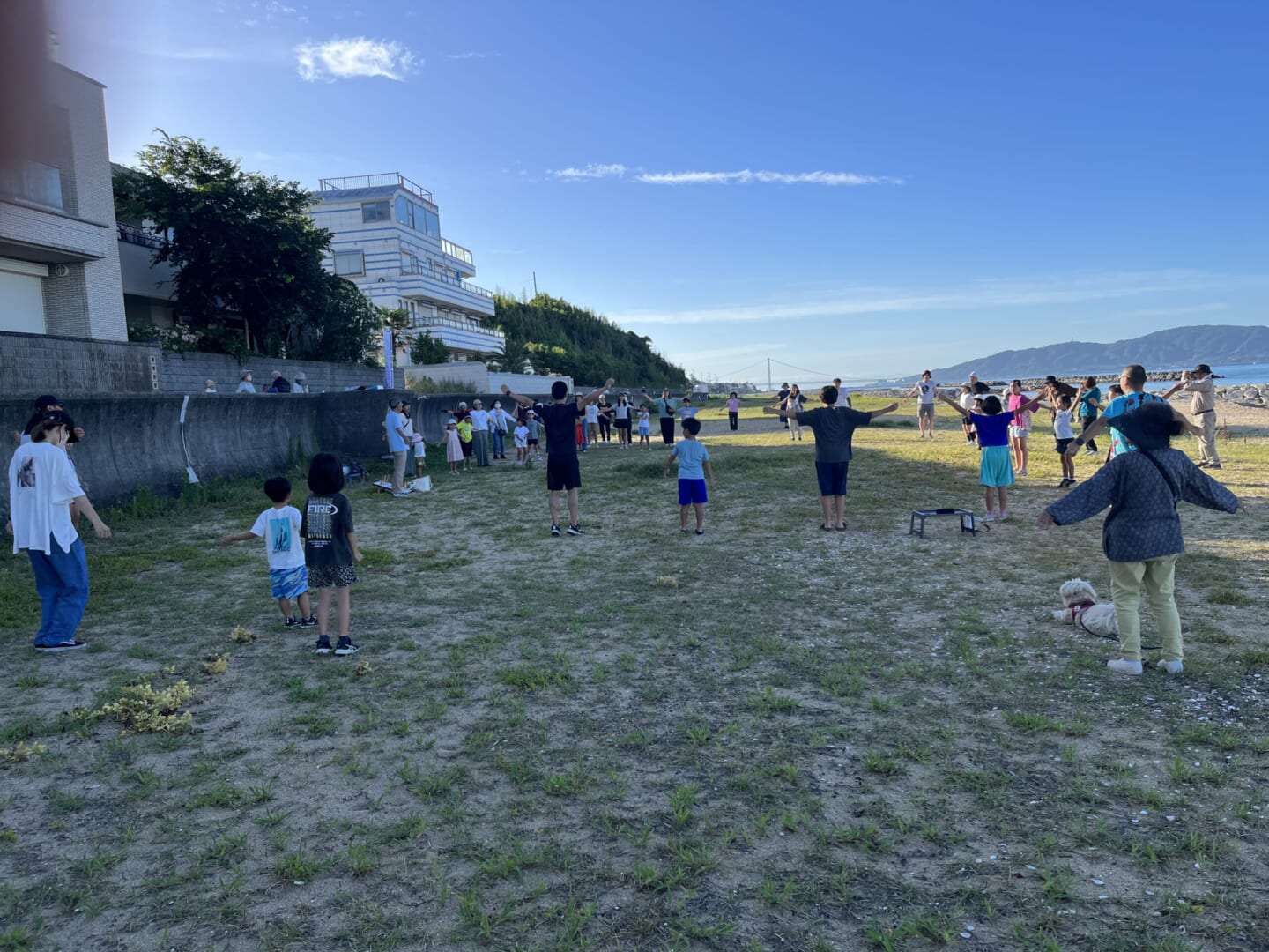 淡路島も見えます。絵に描いたような景色の中でのラジオ体操です。ラジオ体操の後は子ども達の喜ぶ「輪投げ」に今年から「モルック」も加わり、充実した朝のひと時でした。