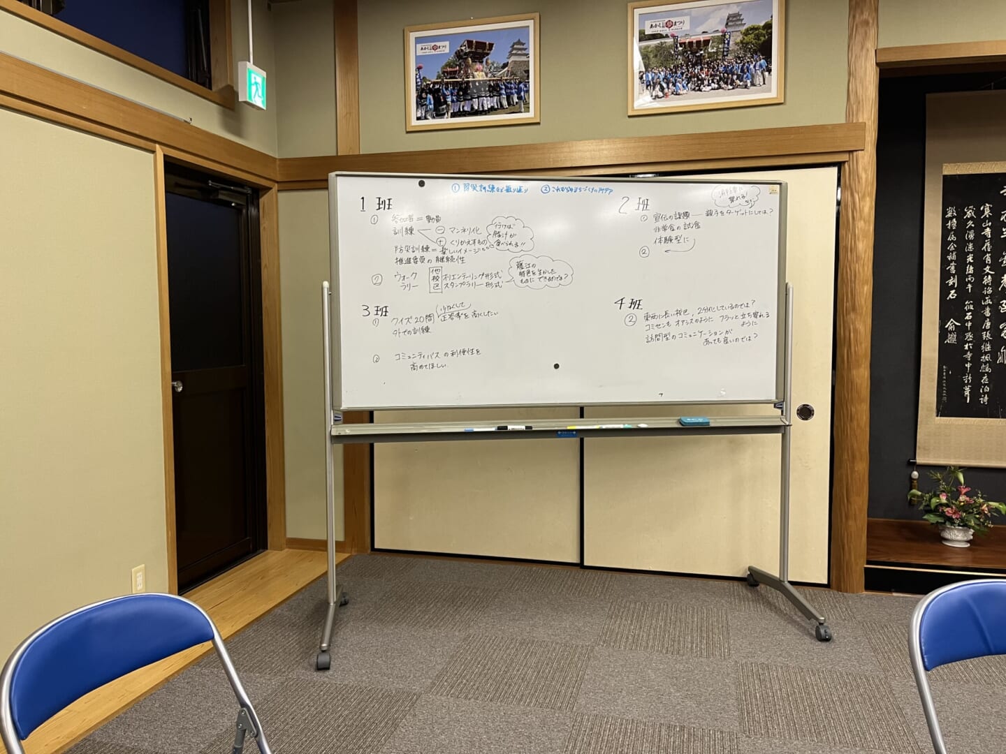 住民有志やまち協サポーター、フレイルサポーターなどに事業部員や役員等30名が集まって、4グループに分かれ、11月開催防災訓練の振り返りやこれかのまちづくりのアイデアなど沢山の意見が出ました。それぞれのグループから発表があり、ホワイトボードに書き出し、全員で内容を共有しました。
