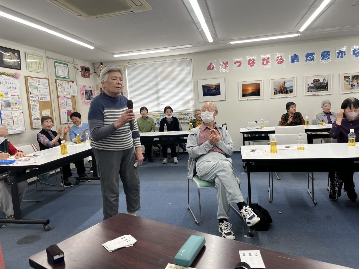 抒情歌や童謡をみんなで合唱し、ネットからリクエスト曲を取り込みひとりで歌う方も増え、のど自慢が始まります。歌の合間に「虹をわたって」で歌体操を、最後にテーマソング「手のひらを太陽に」を歌って散会となりました。