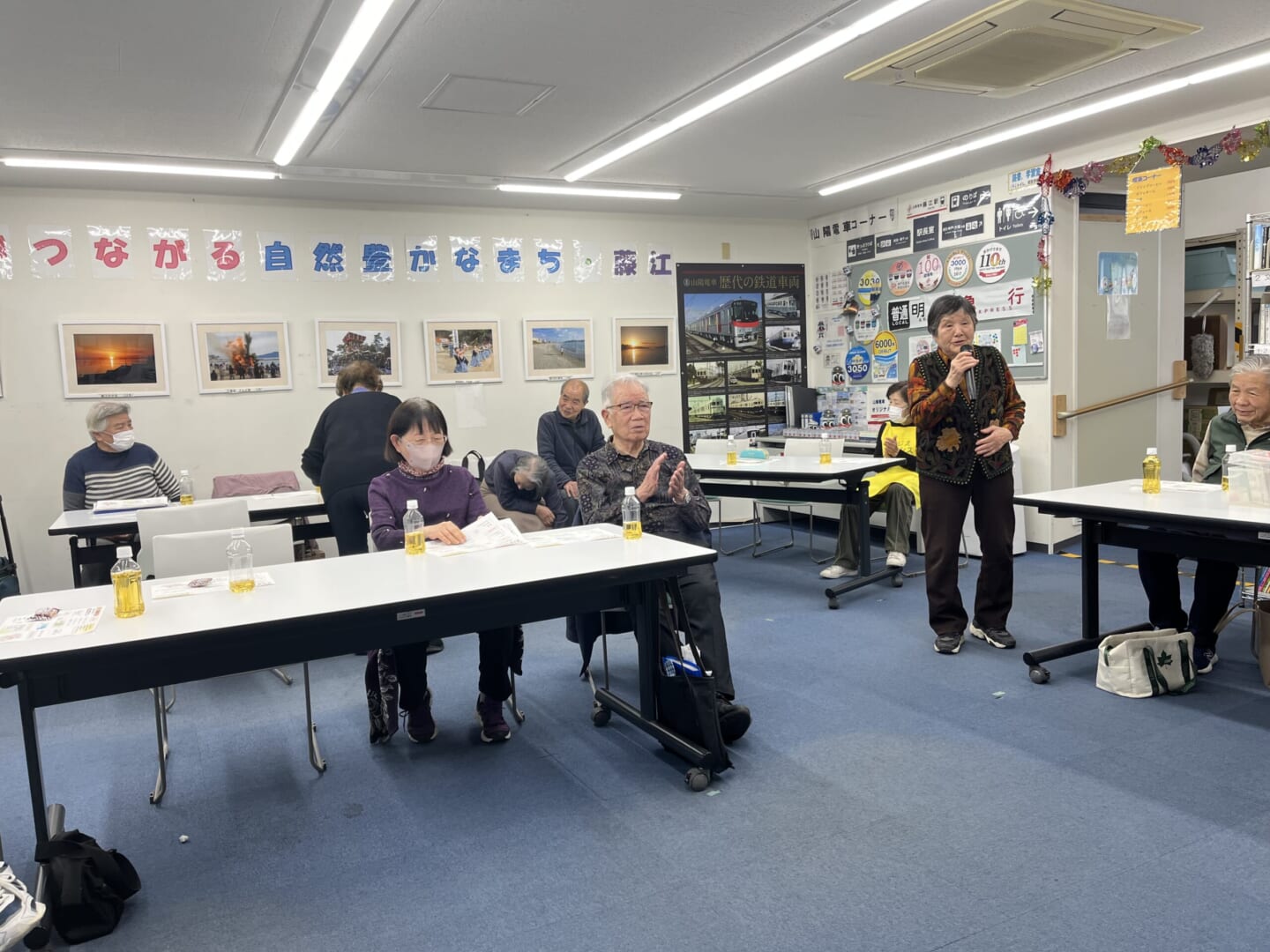本日の参加者は25名、今日も抒情歌「ふるさと」からスタートです。早朝の浜の清掃を終え、清々しい気持ちで歌声広場に参加しました。藤江駅前オアシスは元気な高齢者で熱気に溢れています。