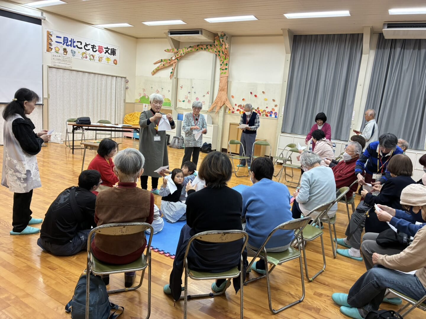 あい☆あいライブラリー読み聞かせイベント 投稿日 2026年1月23日 著者 futamikita カテゴリー 二見北 2025年11月16日(日)「紙芝居・折り紙・読み聞かせお楽しみサロン」を開催。デジタル紙芝居、大型絵本、ストリーミング、紙芝居、折り紙工作では「イカひこうき」を作って大人から子どもまで約20名が楽しく過ごしました。