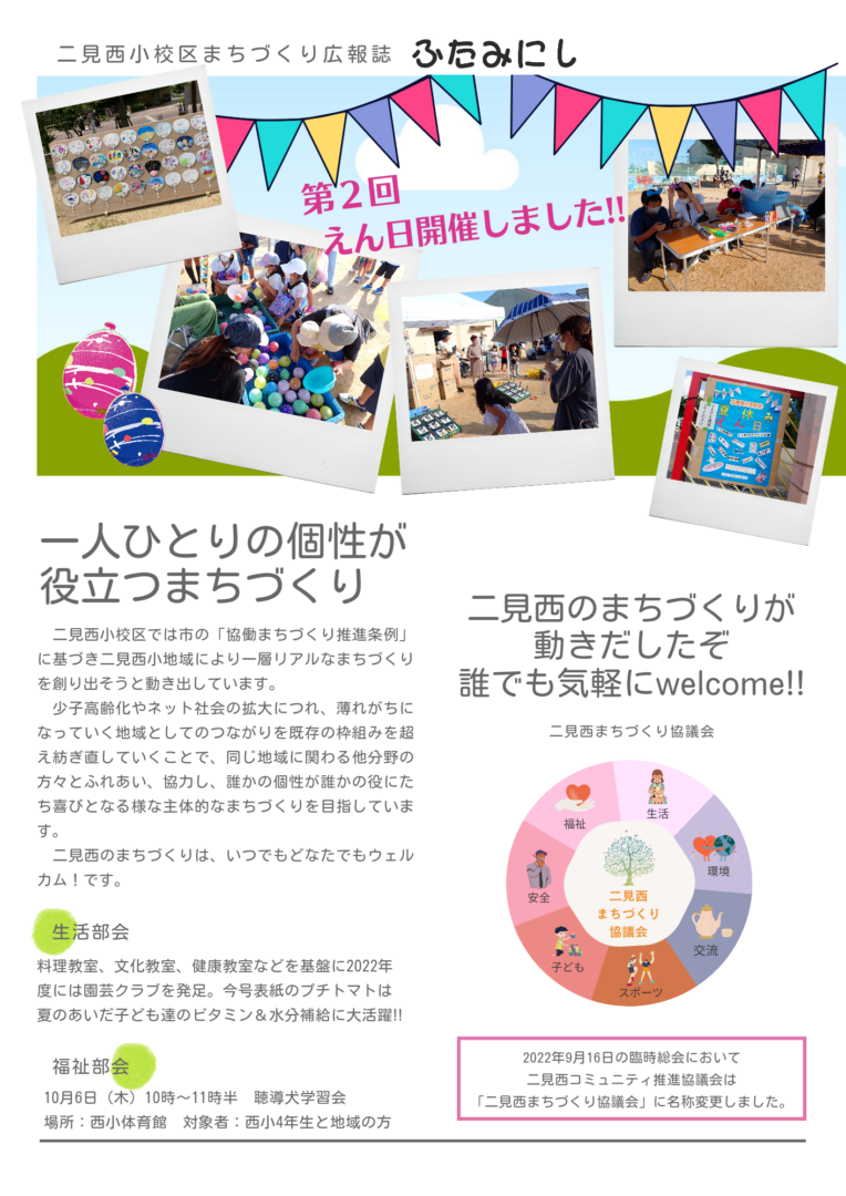| 9月 | あいさつ運動(幼稚園)未定 健康教室(サポートセンター双葉との協働事業) 「今、ふたみにしがおもしろい!」 ⑥ | |