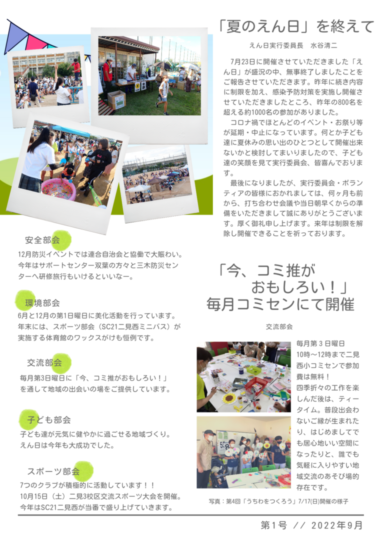 | 4月 | 二見西コミュニティー推進協議会役員総会 ※新型コロナウイルス感染拡大予防のため、書面決議とする 「今、コミ推がおもしろい!」 ① | |