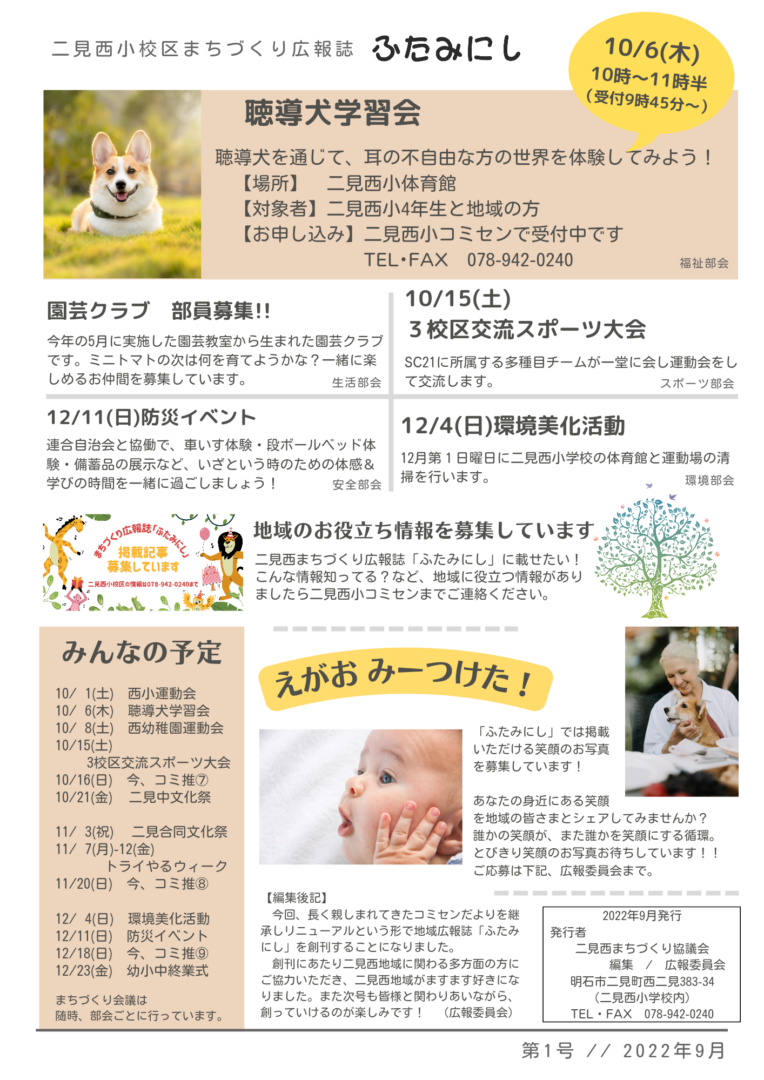 | 10月 | 聴導犬学習会(二見西小4年、地域住民対象) 第2回文化教室(合同文化祭出展作品づくり) 「今、ふたみにしがおもしろい!」 ⑦ | |