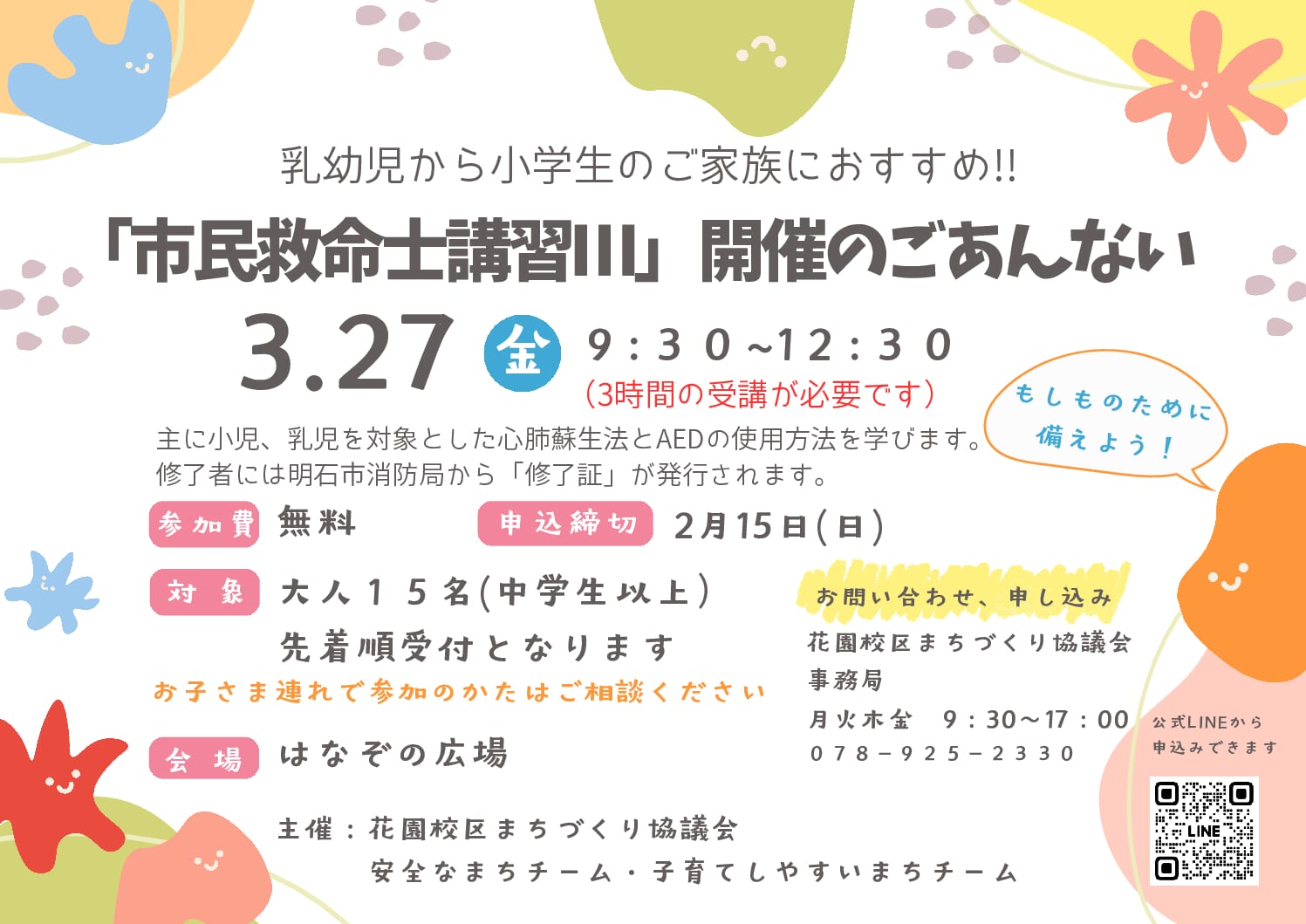 市民救命士講習Ⅲ 参加者募集 投稿日 2026年2月10日 著者 hanazono カテゴリー 花園 3月27日(金)9:30~12:30 はなぞの広場にて「市民救命士講習Ⅲ」を開催します。ただいま参加者募集中です。