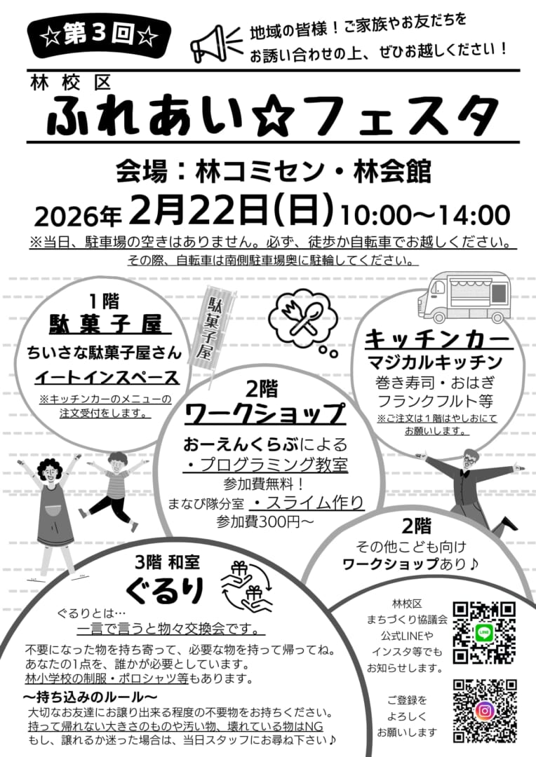 2月22日に第3回目となる『林校区 ふれあい☆フェスタ』を、林コミセン・林会館にて開催いたします。