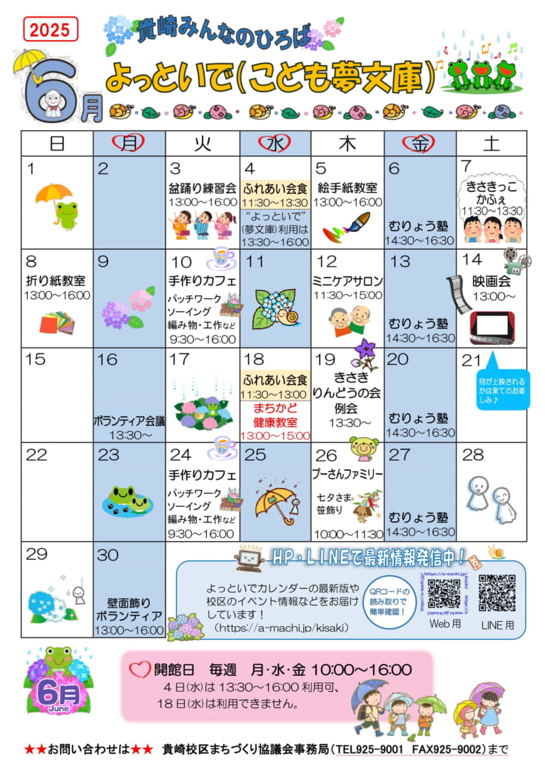 ☆2025年6月開館カレンダー=貴崎みんなの広場”よっといで”☆ 投稿日 2025年4月27日 著者 kisaki カテゴリー 未分類 2025年6月のよっといで(こども夢文庫)カレンダーが完成いたしましたのでアップいたします。カレンダー画像をクリックしていただきますと、PDFデータが開きますので印刷等にご利用ください。