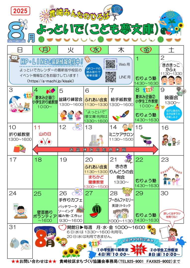 ☆2025年8月開館カレンダー=貴崎みんなの広場”よっといで”☆ 投稿日 2025年6月25日 著者 kisaki カテゴリー 未分類 2025年8月のよっといで(こども夢文庫)カレンダーが完成いたしましたのでアップいたします。カレンダー画像をクリックしていただきますと、PDFデータが開きますので印刷等にご利用ください。