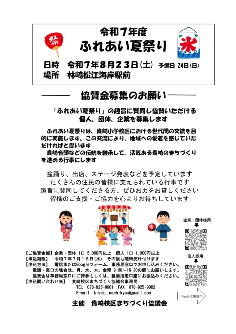 「令和7年度 貴崎ふれあい夏祭り」の趣旨にご賛同のうえ、ご協賛賜りたくお願い申し上げます。