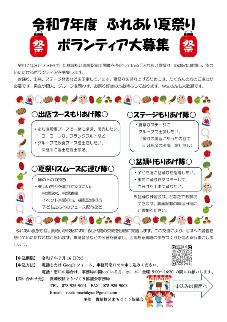 令和7年8月23日(土)に林崎松江海岸駅前で開催を予定している「ふれあい夏祭り」の趣旨に賛同し、協力いただけるボランティアを募集します。