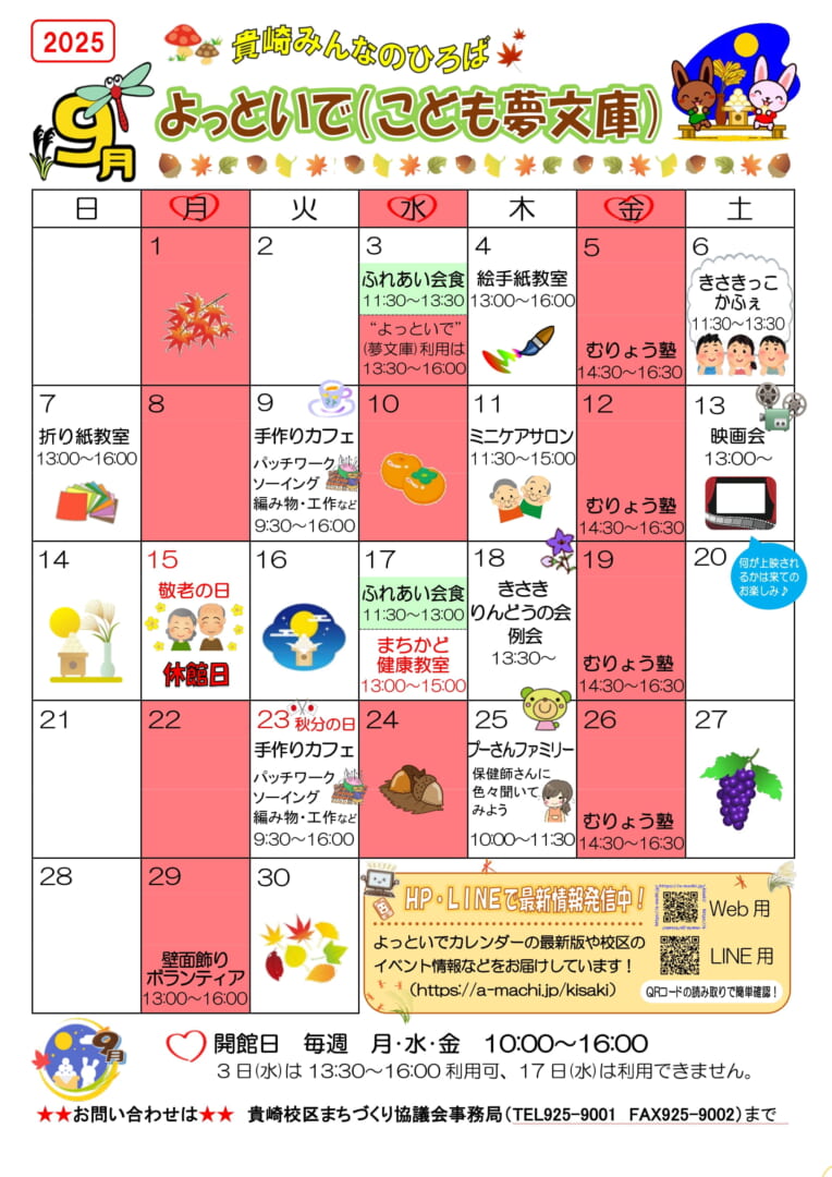 ☆2025年9月開館カレンダー=貴崎みんなの広場”よっといで”☆ 投稿日 2025年7月28日 著者 kisaki カテゴリー 未分類 2025年9月のよっといで(こども夢文庫)カレンダーが完成いたしましたのでアップいたします。カレンダー画像をクリックしていただきますと、PDFデータが開きますので印刷等にご利用ください。