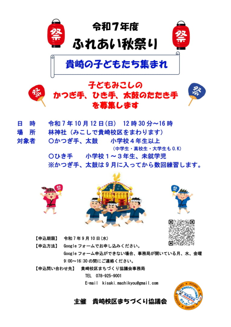 「令和7年度ふれあい秋祭り」で巡行、林神社宮入を予定している子どもみこしのかつぎ手・ひき手・太鼓の叩き手を募集します。