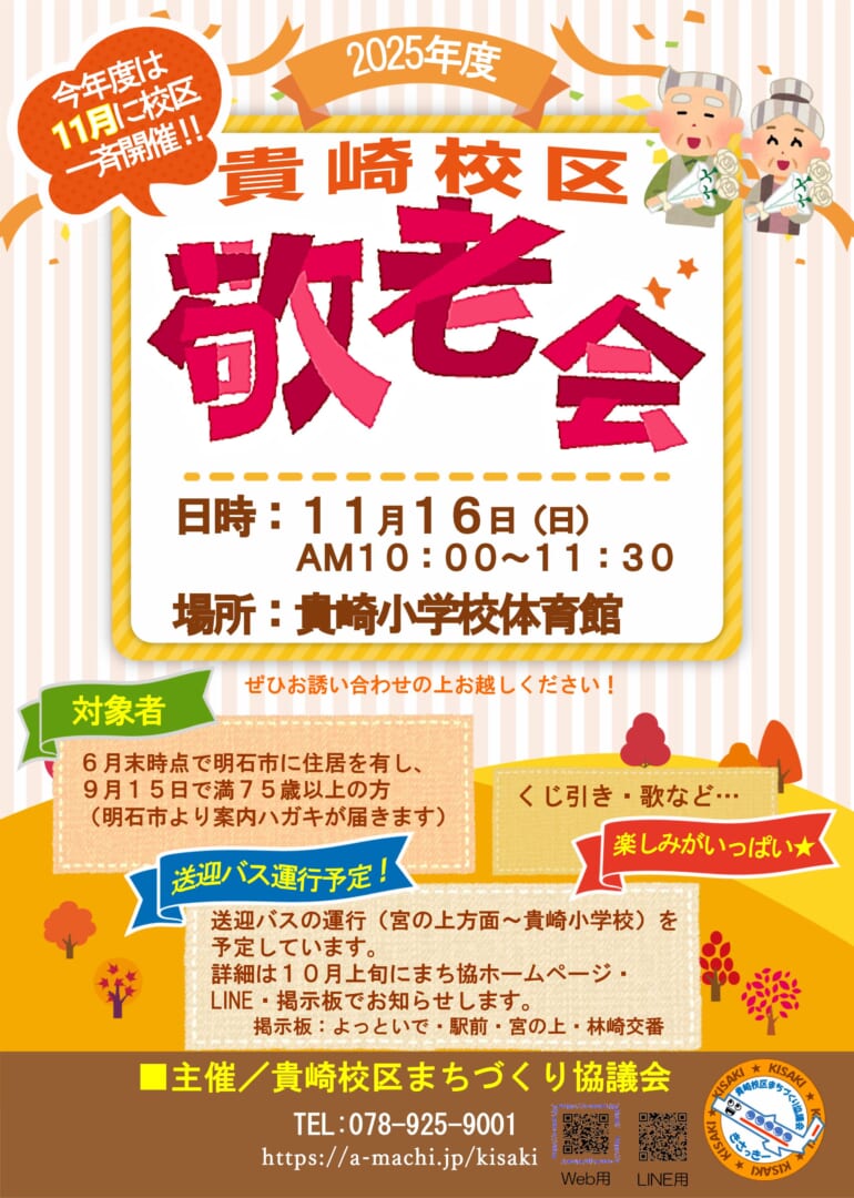 昨年度同様、今年度も校区一斉敬老会を開催いたします!今年は残暑の厳しさを考慮し、少し時期をずらして11月に開催することとなりました。対象者には明石市より案内ハガキが届きます。送迎バスの詳細案内は10月を予定しております。皆さまのお越しをお待ちしております。