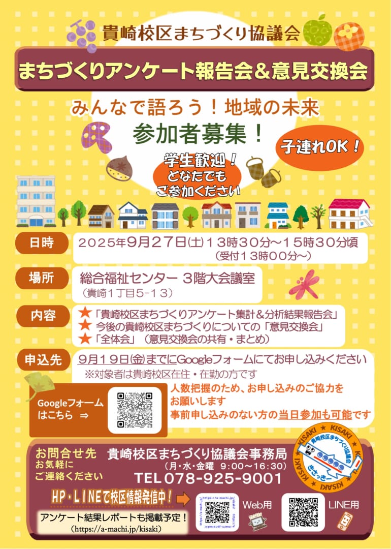 貴崎校区まちづくり協議会からのお知らせです。春に実施しました「まちづくりアンケート」の結果報告会と今後の貴崎校区のまちづくりについての意見交換会を開催します!地域の未来を一緒に考えるために、ぜひお気軽にご参加ください。たくさんのご参加をお待ちしております。