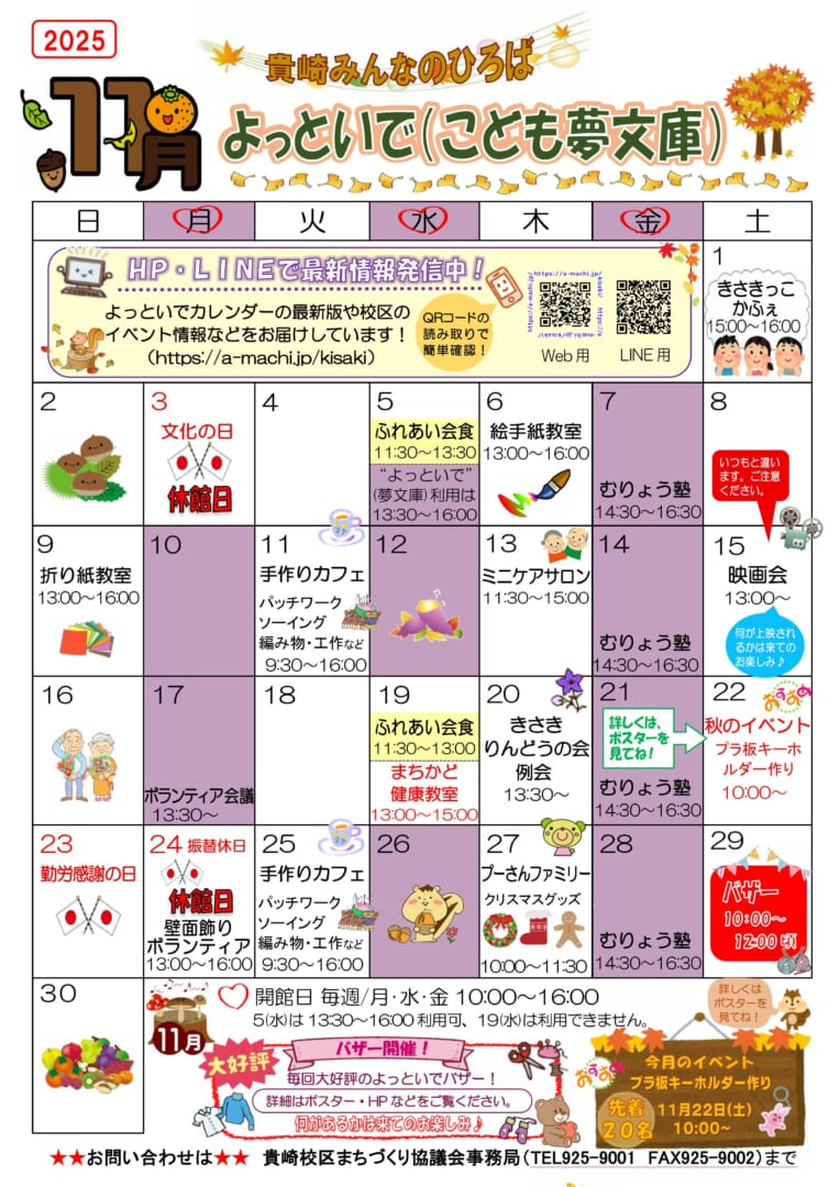 ☆2025年11月開館カレンダー=貴崎みんなの広場”よっといで”☆ 投稿日 2025年9月29日 著者 kisaki カテゴリー 未分類 2025年11月のよっといで(こども夢文庫)カレンダーが完成いたしましたのでアップいたします。カレンダー画像をクリックしていただきますと、PDFデータが開きますので印刷等にご利用ください。