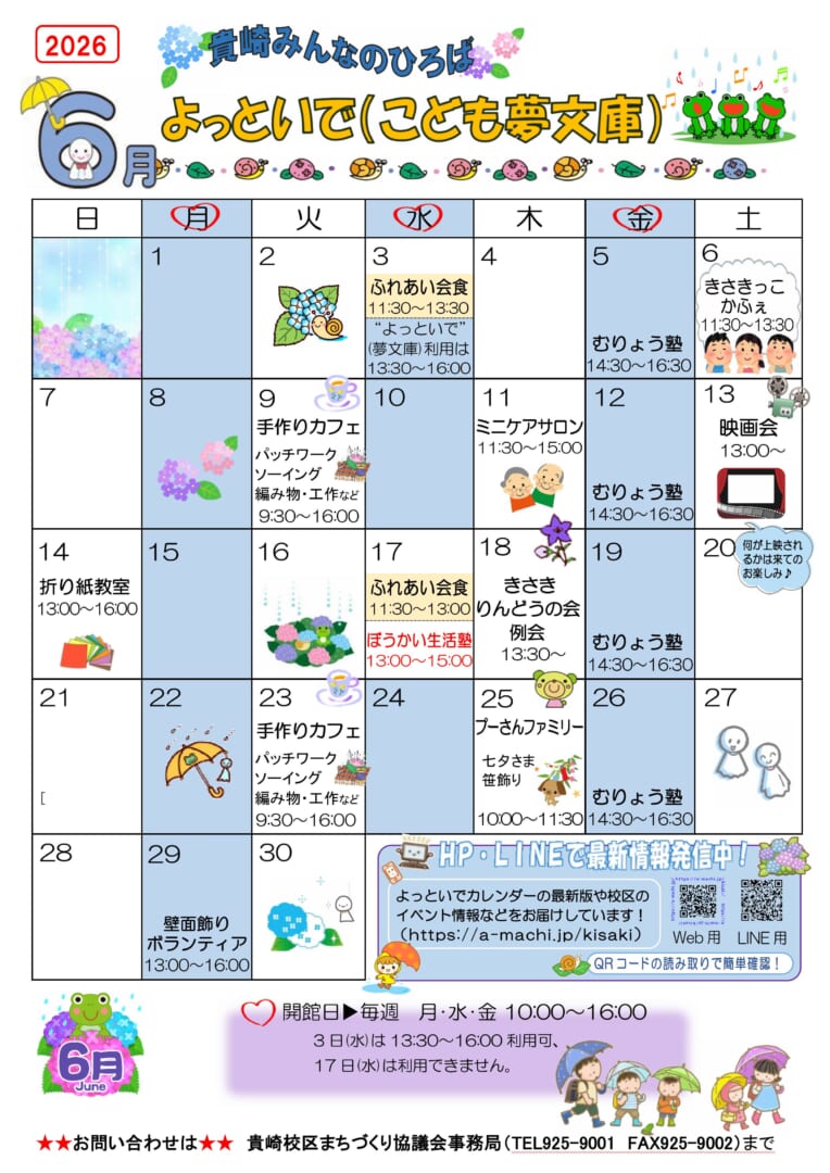 ☆2026年6月開館カレンダー=貴崎みんなの広場”よっといで”☆ 投稿日 2026年4月27日 著者 kisaki カテゴリー 未分類 2026年6月のよっといで(こども夢文庫)カレンダーが完成いたしましたのでアップいたします。カレンダー画像をクリックしていただきますと、PDFデータが開きます