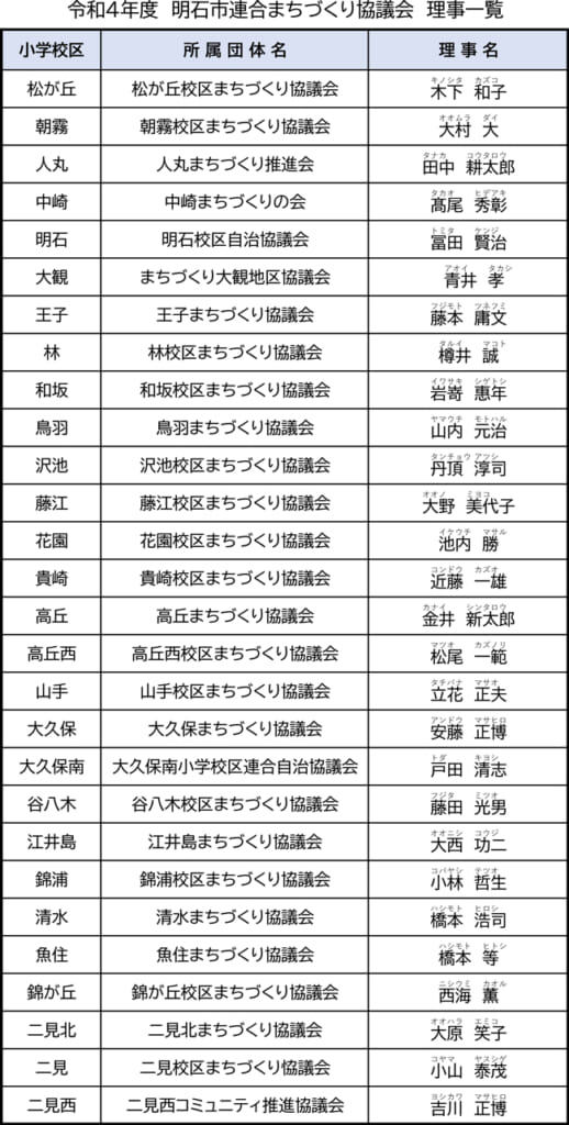 現在、明石市ではすべての小学校区において、自治会、高年クラブ、PTA、子ども会、ボランティア団体等が連携した「校区まちづくり組織」が結成されており、特色あるまちづくりに取り組んでいます。校区連合自治会長の集まりだった明石市連合自治協議会も、校区まちづくり組織の代表者で構成する「明石市連合まちづくり協議会」に移行し、より幅広く連携と情報共有を進めていくこととなりました。
