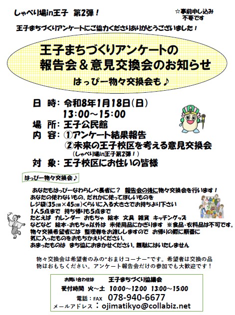 王子まちづくりアンケートの報告会&意見交換会のお知らせ 投稿日 2026年1月11日 著者 ouji カテゴリー 未分類 王子まちづくりアンケートの報告会&意見交換会を開きます。 ハッピー物々交換会も開きますので ぜひ 多数ご参加お待ちしています!