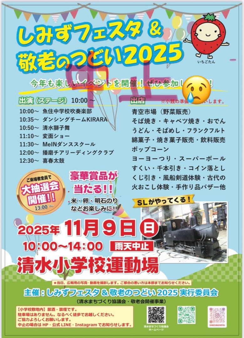 「しみずフェスタ&敬老のつどい2025」は雨のため中止といたします。