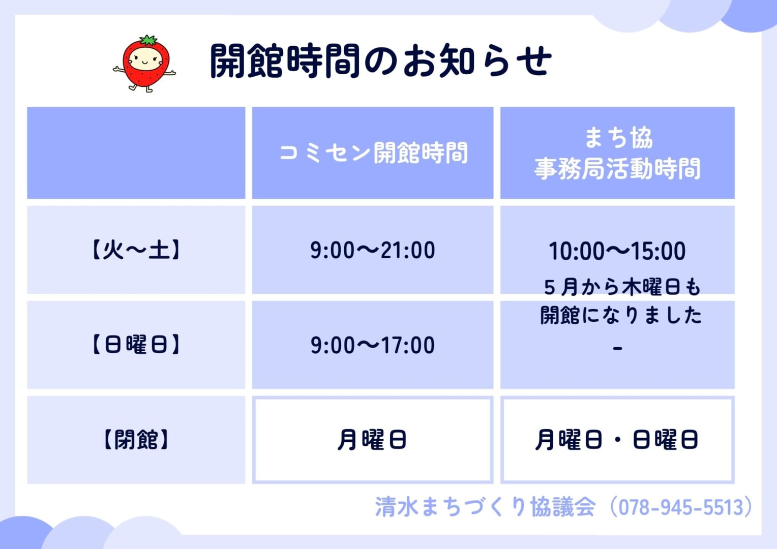 5月より、火曜日から土曜日の10時~15時を活動日とさせていただきます。