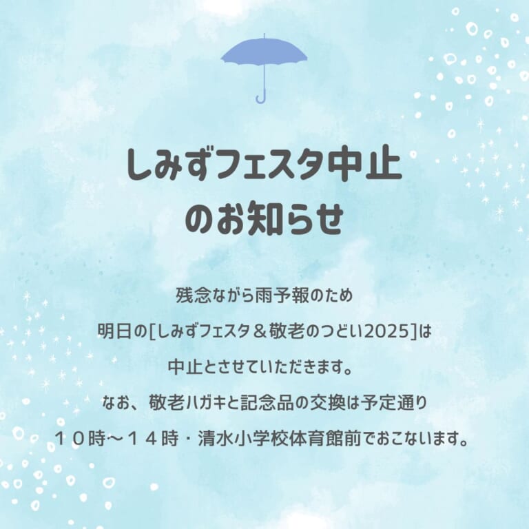 令和7年11月9日(日)10:00~開催を予定しておりました 「しみずフェスタ&敬老のつどい2025 […] -