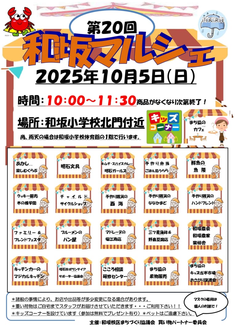第20回 和坂マルシェのご案内(10月5日に開催) 投稿日 2025年8月29日 著者 wasaka カテゴリー 和坂 10月5日(日)午前10時から和坂小学校で「第20回和坂マルシェを開催します。 皆様のご来場をお待ちしております。