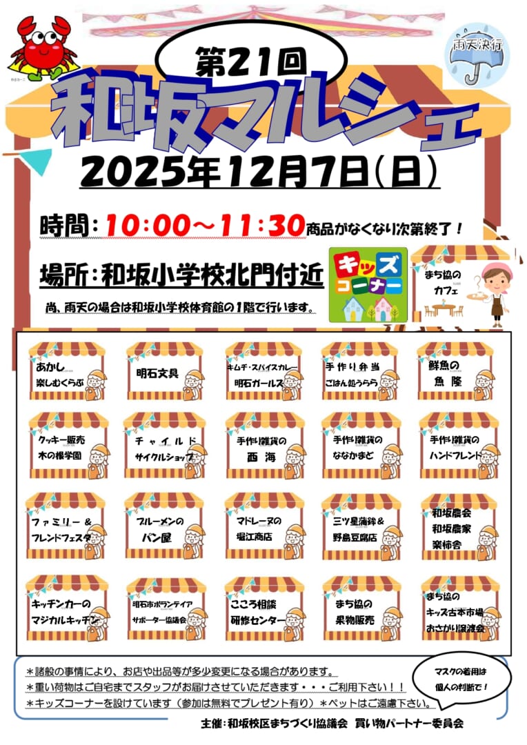 第21回和坂マルシェのご案内(12月7日に開催) 投稿日 2025年11月10日 著者 wasaka カテゴリー 和坂 12月7日(日)午前10時から和坂小学校で「第21回和坂マルシェ」を開催します。 皆様のご来場をお待ちしております。