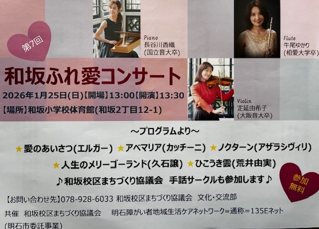 明石障がい者地域生活ケアネットワーク(135Eネット)と和坂校区まちづくり協議会では、1月25日(日)午後1時30分から和坂小学校体育館で「第7回 和坂ふれ愛コンサート」を開催します。今回の演奏曲目は「愛のあいさつ」(エルガー)、「アベマリア」(カッチーニ)、「人生のメリーゴーランド」(久石譲)などお馴染みの曲です。演奏いただくのは、ピアノ長谷川香織さん、フルート牛尾ゆかりさん、バイオリン定延由希子さんの皆さんで、手話サークルの皆さんも参加します。入場無料ですので、お気軽にご参加ください。お問い合わせ先:和坂校区まちづくり協議会(℡078-928-6033)