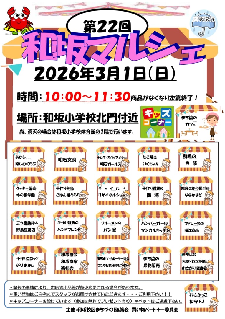 第22回和坂マルシェのご案内(3月1日に開催) 投稿日 2026年2月22日 著者 wasaka カテゴリー 和坂 まちづくり協議会買い物パートナー委員会では、「第22回和坂マルシェ」を3月1日(日)午前10時から和坂小学校で開催します。皆様のご来場をお待ちしております。