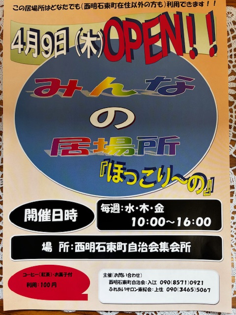 [みんなの居場所 ほっこり~の」が4月9日にオープン(西明石東町自治会) 投稿日 2026年4月18日 著者 wasaka カテゴリー 和坂 西明石東町自治会では、地域の居場所づくりをめざして「みんなの居場所 ほっこり~の」を4月9日から開設しています。開催日時は毎週水曜日~金曜日の午前10時~午後4時で、開催場所は西明石東町自治会集会所(鳥羽大東公園の北側新幹線高架下)です。費用は100円で、西明石東町以外の方でもご利用いただけます。お気軽にお立ち寄りください。