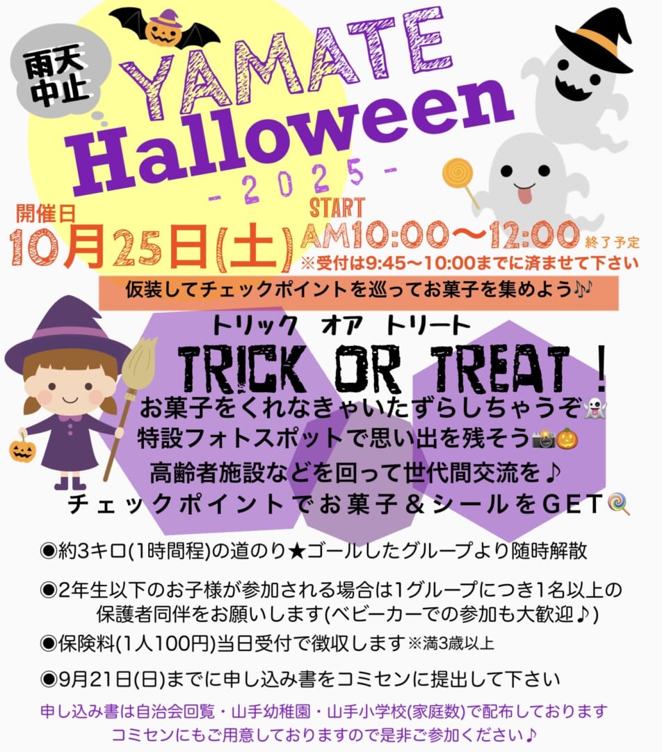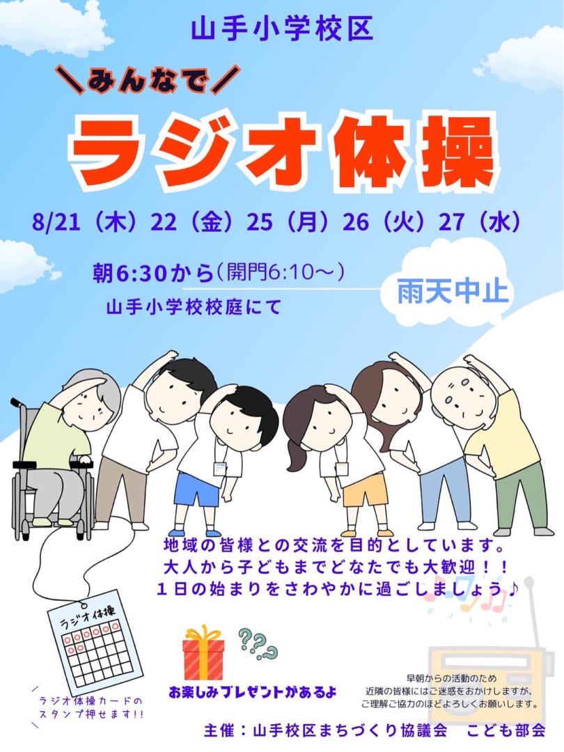 子ども部会 イベントのお知らせ みんなでラジオ体操 どなたでも参加自由!!山手小学校グラウンドにて朝6:30より開始(5分前には来場ください)♪ ハロウィンイベント 地域の福祉施設の皆様にチェックポイントとしてご協力いただきました! 世代間交流をしながら仮装やお菓子を貰うイベントを楽しもう♪